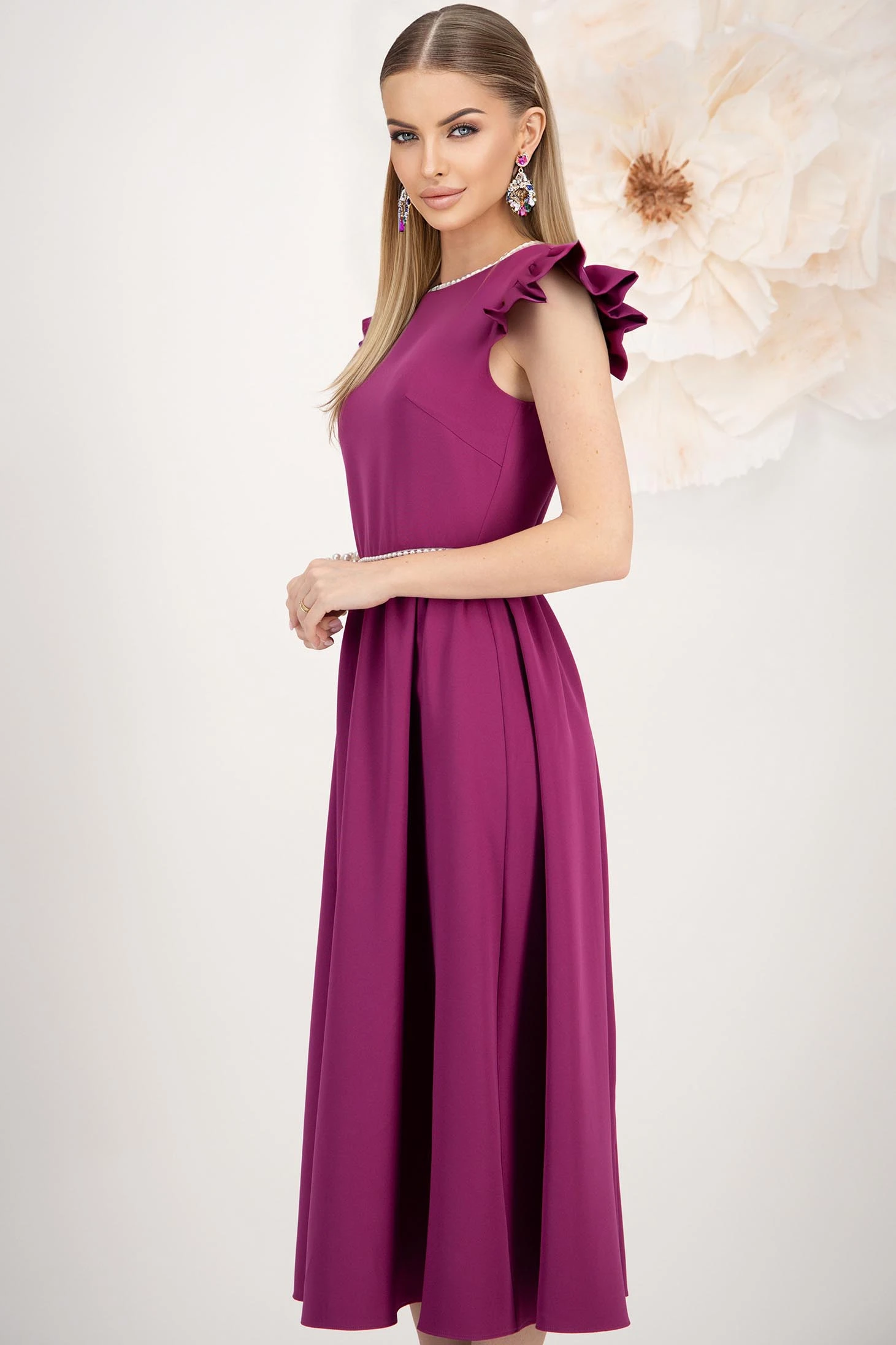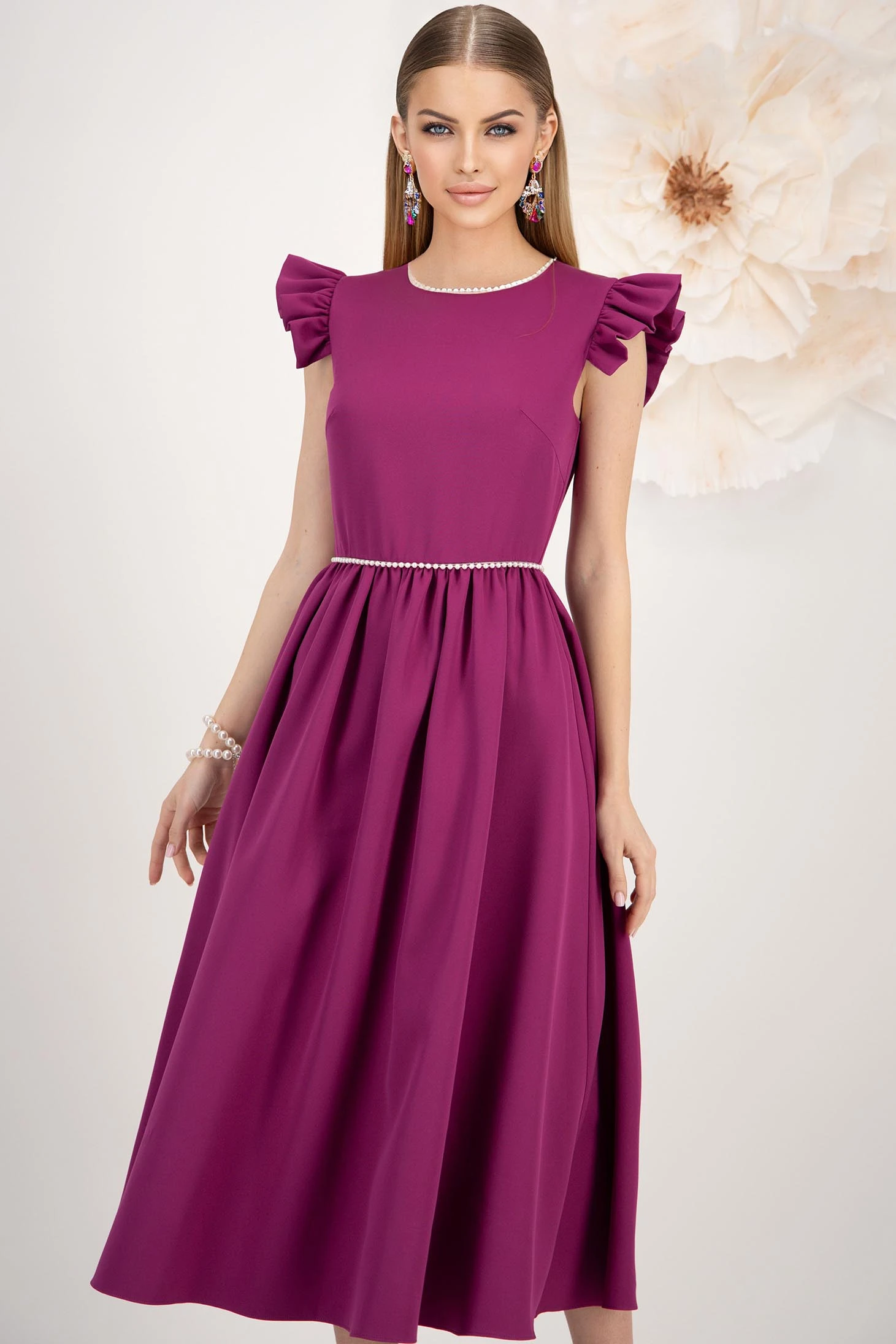 Această rochie mov elegantă este confecționată dintr-o stofă ușor elastică, de densitate medie, care asigură un echilibru perfect între confort și rafinament. Croiul în cloș oferă o siluetă feminină și grațioasă, punând în valoare linia taliei.