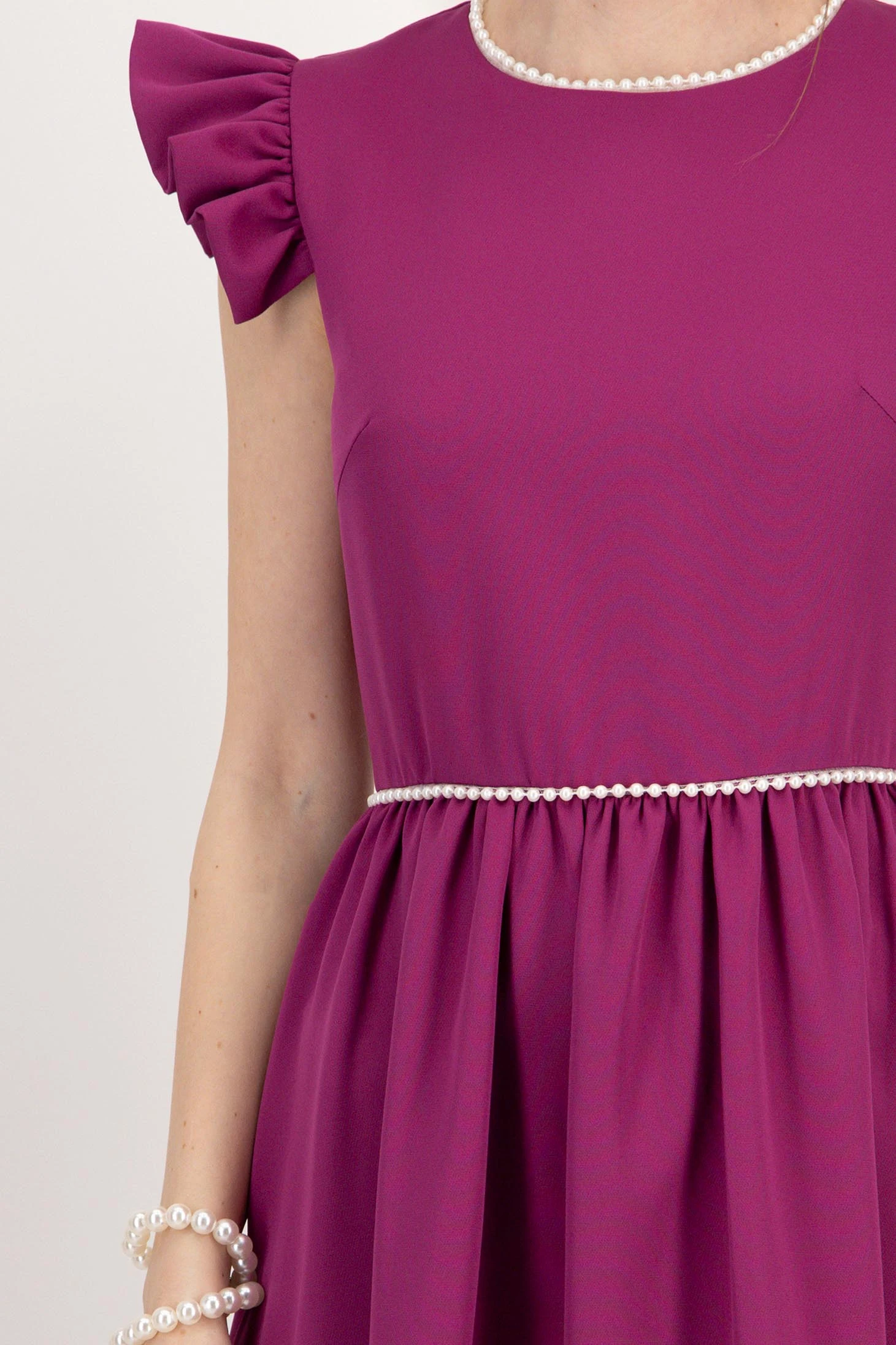 Decolteul rotunjit este delicat accentuat de aplicațiile subtile de perle, care se regăsesc și în talie, adăugând o notă de eleganță sofisticată. Mânecile scurte sunt decorate cu volănașe diafane, conferind un aer romantic și rafinat ținutei.