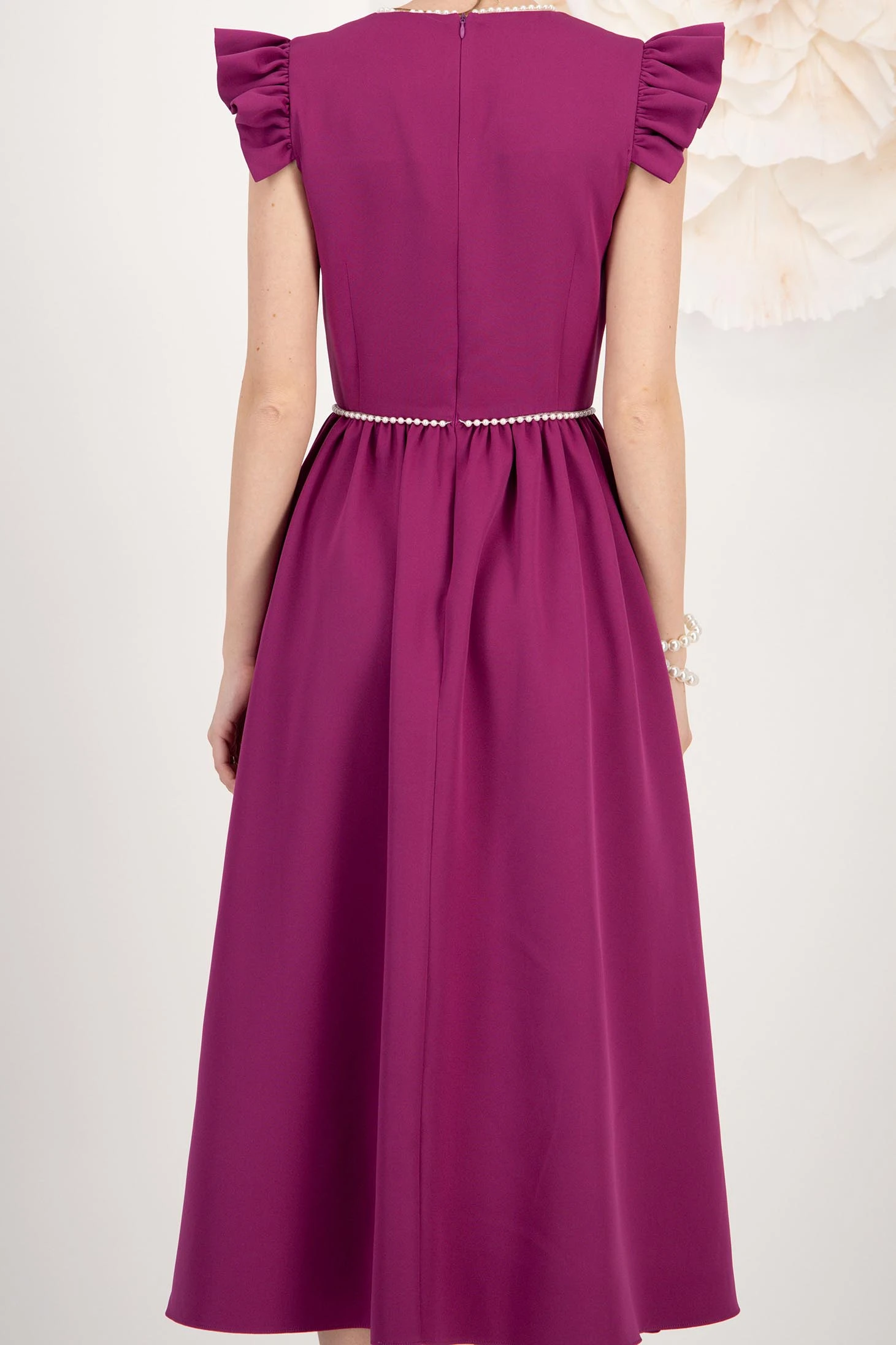 Decolteul rotunjit este delicat accentuat de aplicațiile subtile de perle, care se regăsesc și în talie, adăugând o notă de eleganță sofisticată. Mânecile scurte sunt decorate cu volănașe diafane, conferind un aer romantic și rafinat ținutei.
