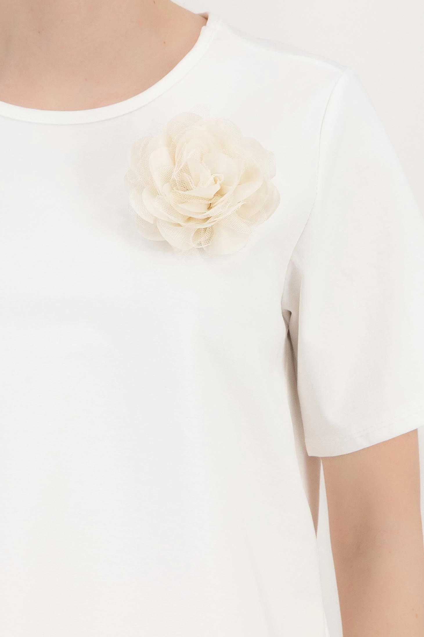 Un detaliu deosebit este broșa în formă de floare, care adaugă o notă jucăușă și un element de originalitate, transformând tricoul dintr-o piesă simplă într-un item cu personalitate.